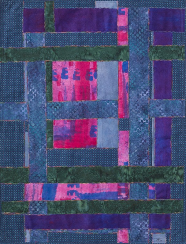Cotton, linen hand-dyed, screen printed. Machine stitched and embroidered